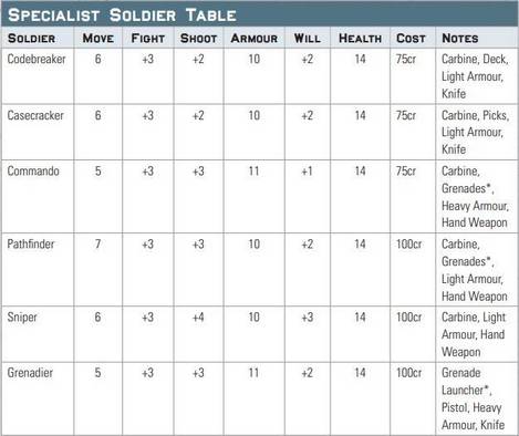 Une partie de la table des soldats Spécialistes